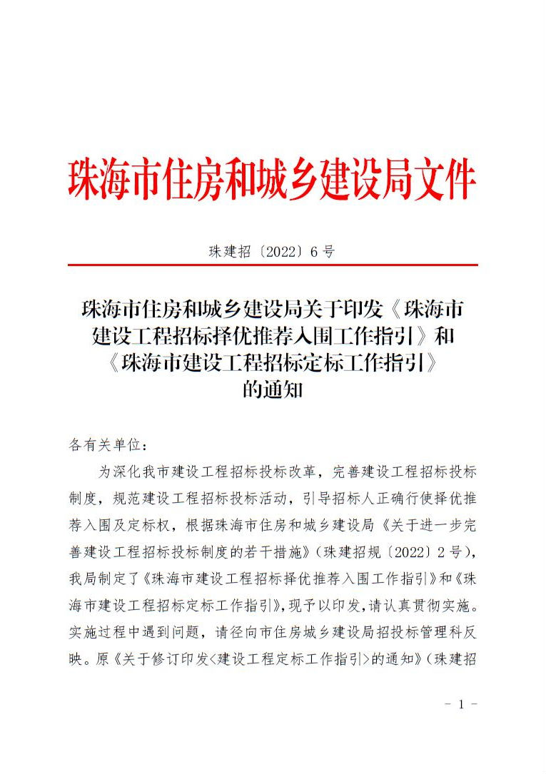 • 珠海市住房和城鄉(xiāng)建設局關于印發(fā)《珠海市建設工程招標擇優(yōu)推薦入圍工作指引》和《珠海市建設工程招標定標工作指引》的通知